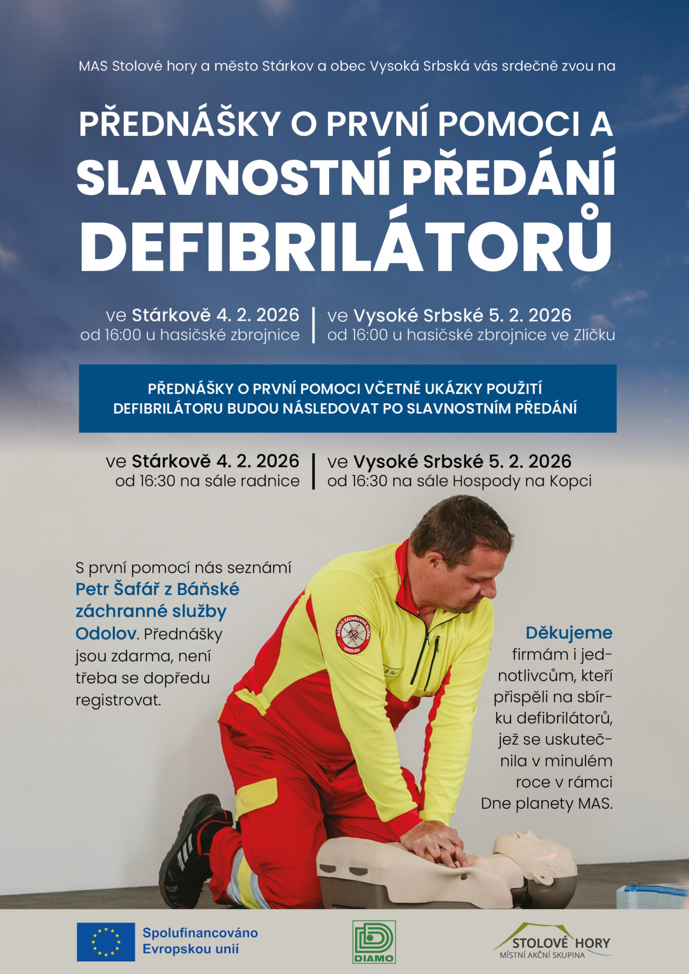 Místní akční skupina Stolové hory společně s městem Stárkov a obcí Vysoká Srbská srdečně zve veřejnost na slavnostní předání automatických externích defibrilátorů (AED), které budou následně umístěny u místních hasičských zbrojnic. Součástí programu budou také bezplatné přednášky o první pomoci, včetně praktického seznámení s použitím defibrilátoru.
