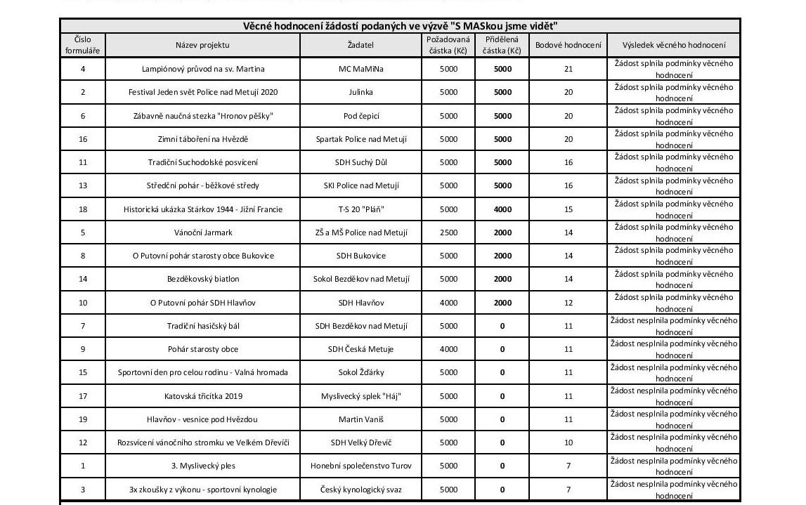 Výslekdy výzvy „S MASkou jsme vidět“ si můžete prohlédnout v následující tabulce a nebo ZDE: