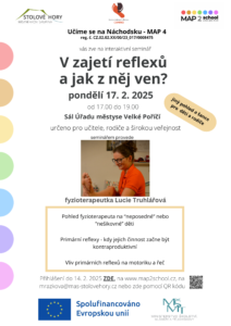 Zveme vás na seminář věnovaný vlivu primárních reflexů na motoriku a řeč. Účastníci z řad pedagogů, ale i rodičů a široké veřejnosti se dozvědí o vývoji dítěte z hlediska primárních reflexů, které jsou s dozráváním mozku překrývány osvojovanými dovednostmi. Pokud je vývoj dítěte nerovnoměrný a primární reflexy přetrvávají, mohou vznikat různé druhy dráždivostí nepříznivě ovlivňující pohyb a řeč. Fyzioterapeutka Lucie Truhlářová z Centra zdravého pohybu Camino přináší jiný pohled a šanci pro „neposedné“ a nebo „nešikovné“ děti a žáky a jejich rodiče.