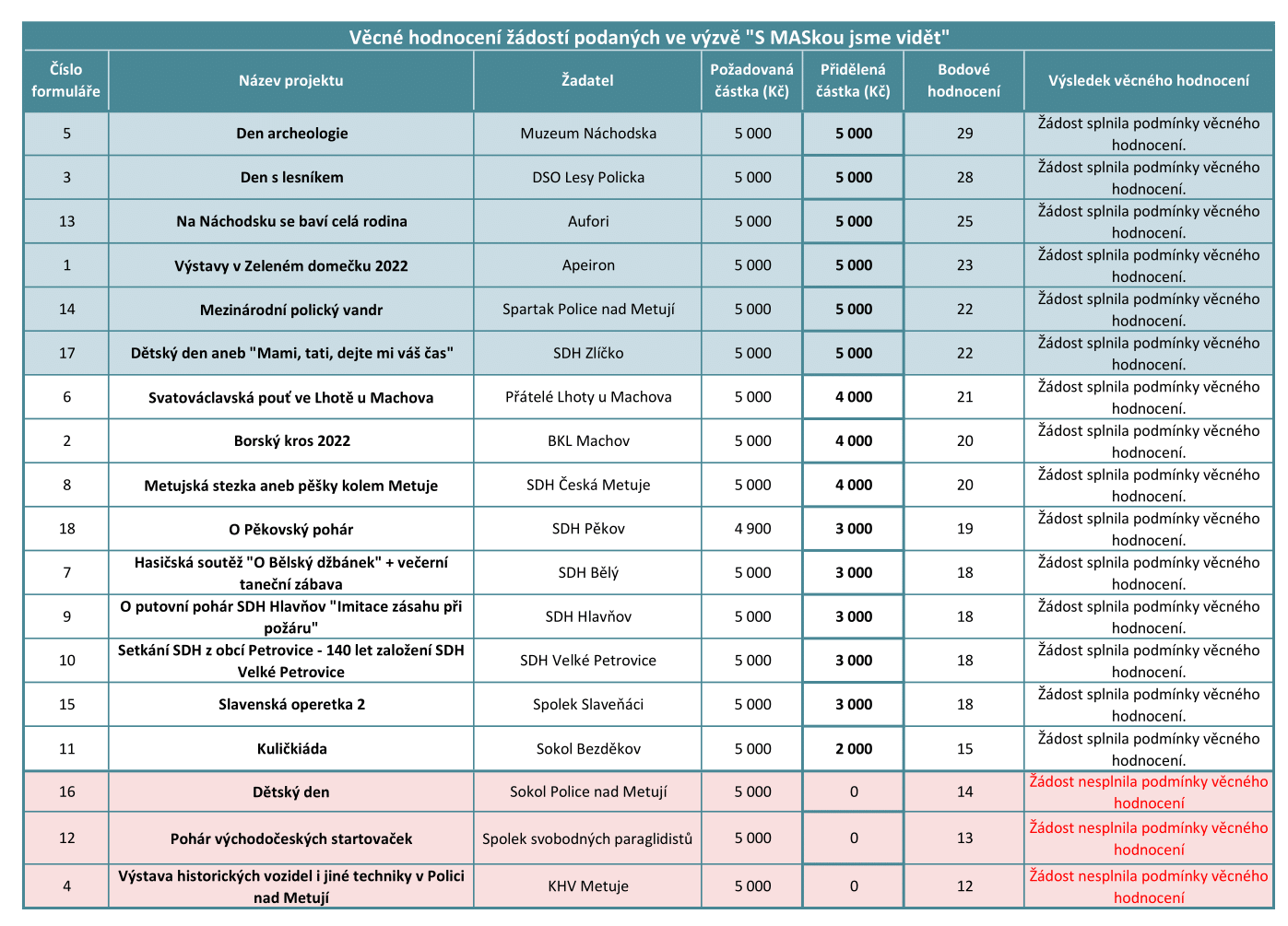 Původní alokace byla 30 000 Kč a měla vystačit na 6 nejlépe hodnocených projektů. Vzhledem k tomu, že věcným hodnocením prošlo hned 15 projektů, tak rada MAS rozhodla, že alespoň částečně podpoří každou akci, která splnila podmínky věcného hodnocení. Alokace výzvy tedy byla navýšena na 59 000 Kč.